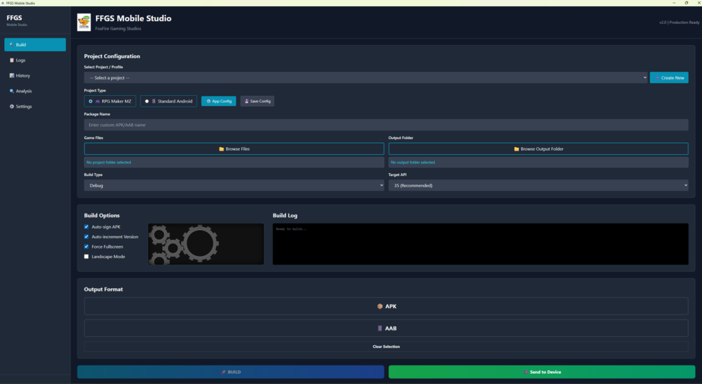 Convert your RPG Maker MZ games into Android APK and AAB files with one click. No command-line wrestling, no dependency headaches — just pick your project, configure your settings, and build. FFGS Mobile Studio handles everything: Android SDK setup, Cordova packaging, signing, versioning, and even wireless transfer to your device via QR code. Key Features: • One-click APK & AAB builds (debug and release) • Setup Lizard — auto-installs all build dependencies • 5 professional themes (Dark, Art Deco, Art Nouveau, Cyberpunk, Matrix) • Build profiles — save unlimited project configurations • APK/AAB analysis and validation tools • Real-time color-coded build logs • Build history tracking (last 50 builds) • Custom app logo, splash screen, and permissions • QR code wireless transfer to device • Auto-increment version codes • Also supports standard Android projects Works with RPG Maker MZ and standard Android projects. Windows 10/11 x64.